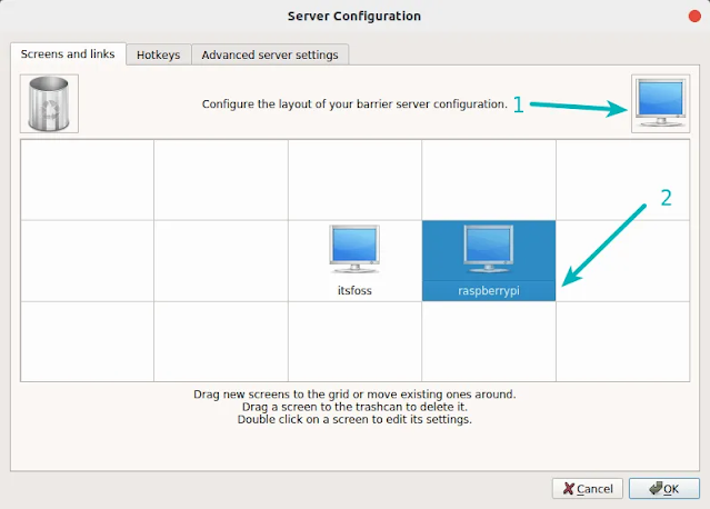 Jika sudah terkoneksi pada komputer server perlu dilakukan settingan letak layar. Tekan pada tombol Configure Server, akan muncul popup konfigurasi. Tambahkan layar monitor baru dan rename screen sesuai dengan nama host dari komputer klien. Letakan layar monitor sesuai posisi yang diinginkan dan klik OK. Tekan tombol Reload untuk merestart server agar settingan konfigurasi bisa berjalan. Jangan lupa klik juga tombol Reload pada aplikasi barrier di komputer klien.