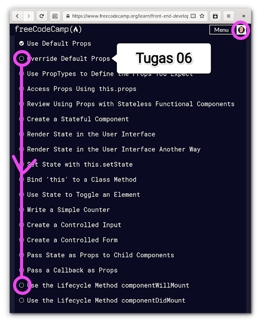 Tugas 06 (React - B) ini mahasiswa sila mengerjakan bagian 17 s.d 32 dari React pada kelas Front End Development Libraries di freeCodeCamp.org.